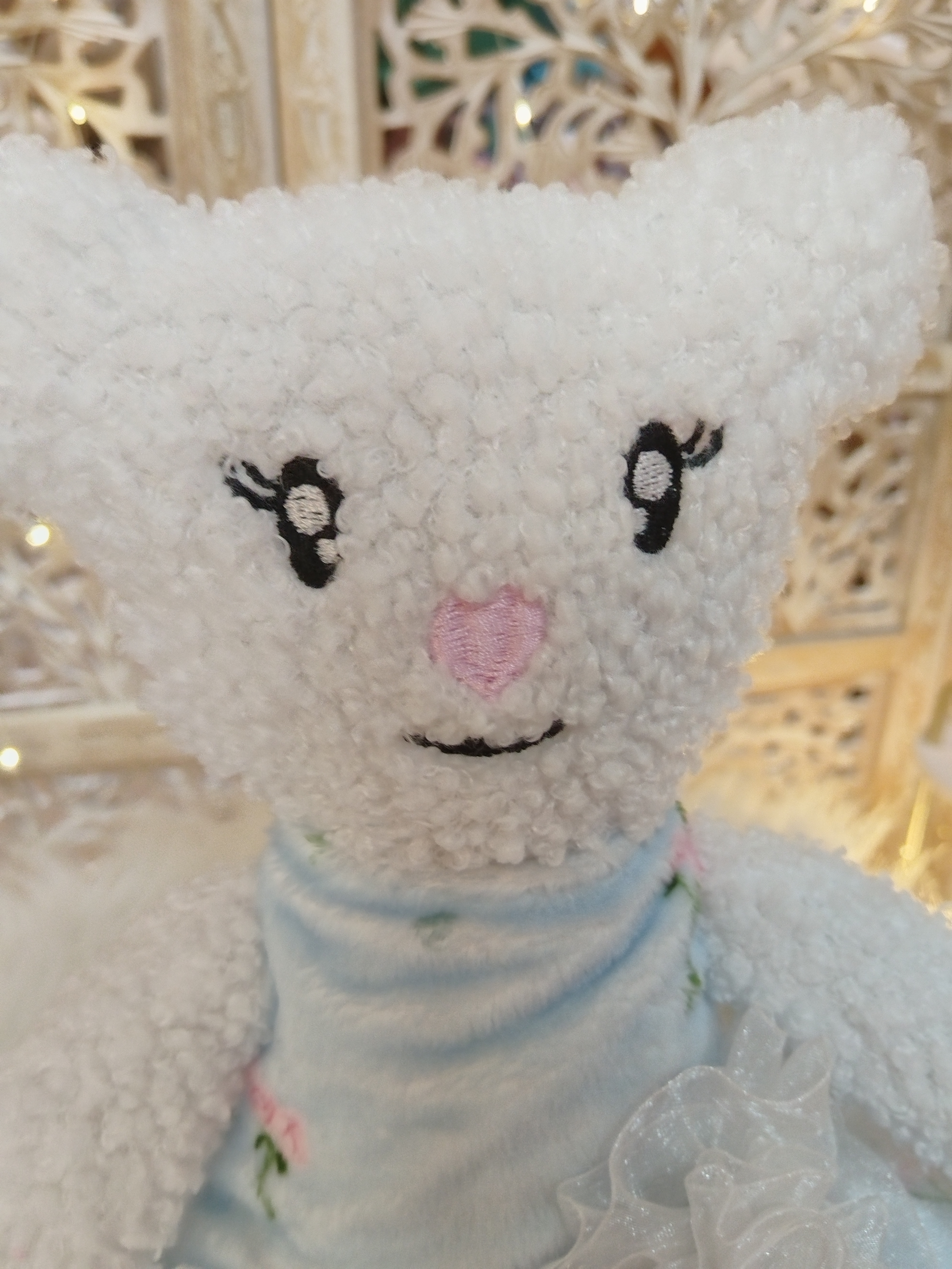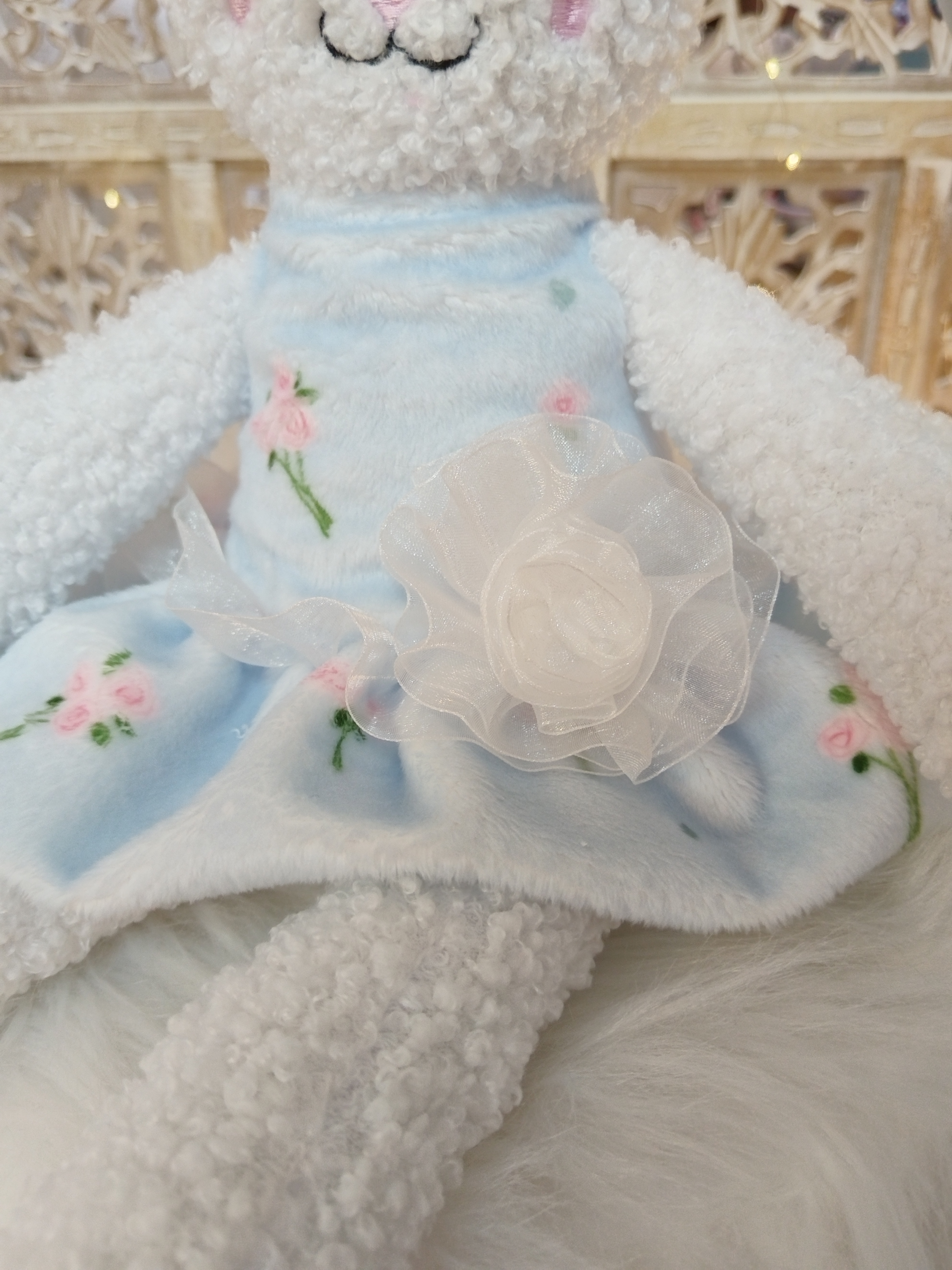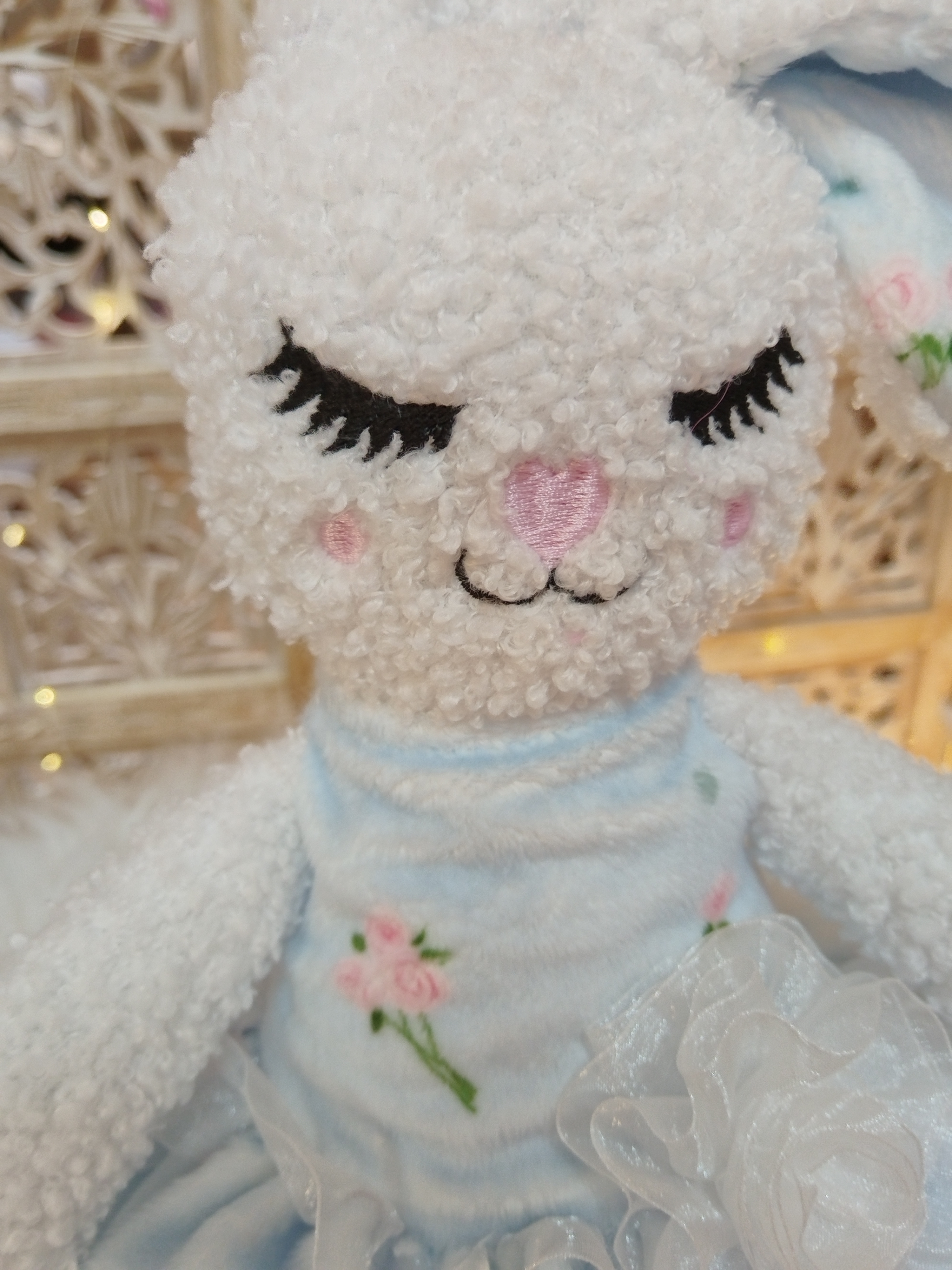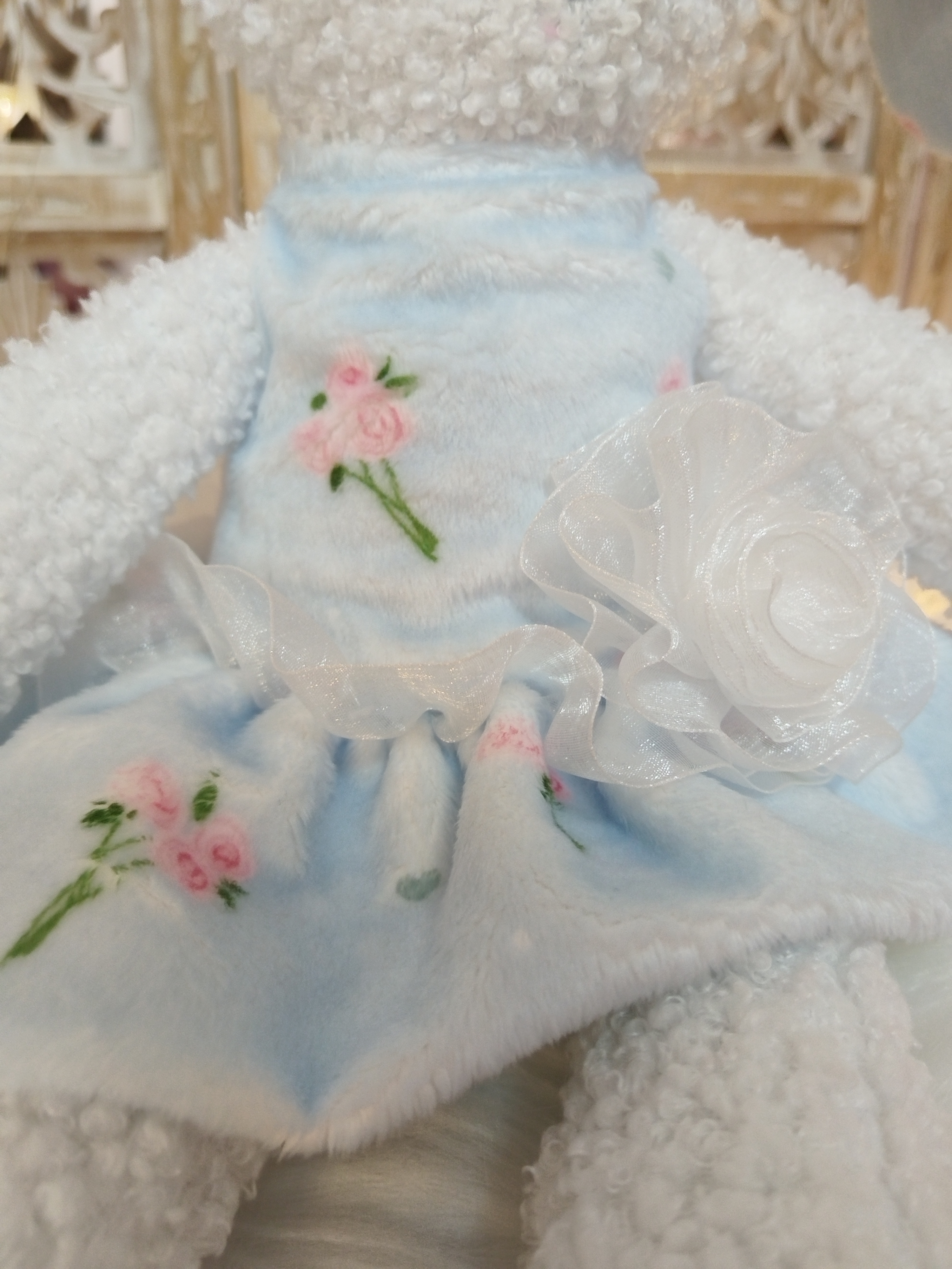 ✨ Modèle Jouet 📏 Dimensions ± 40 cm ⚜️ Matières • Fourrure bouclette • Robe amovible en minky avec volant en organza 🌸 Détails • Visage brodé • Jouet sonore avec grelot • Robe amovible 🧼...