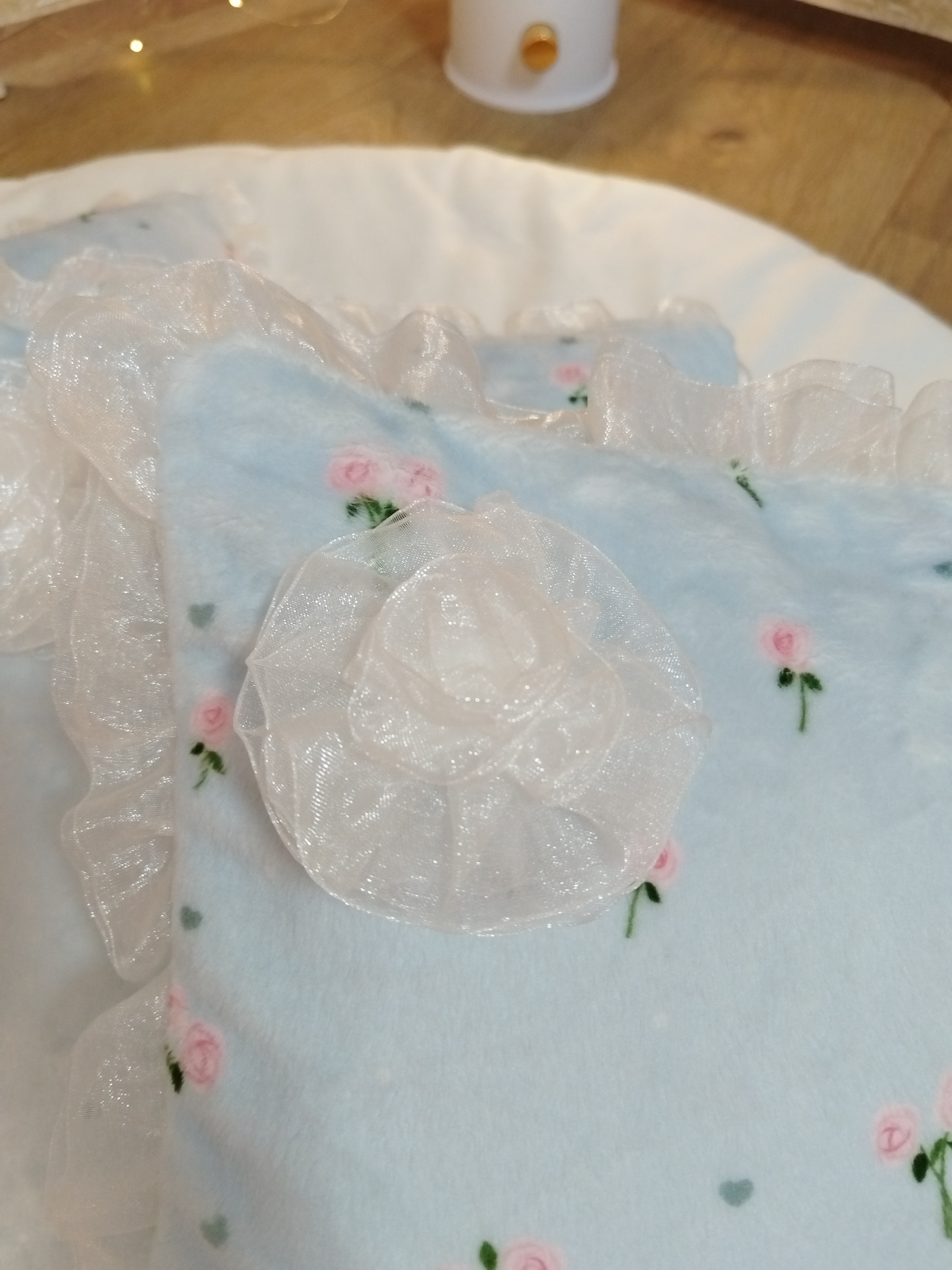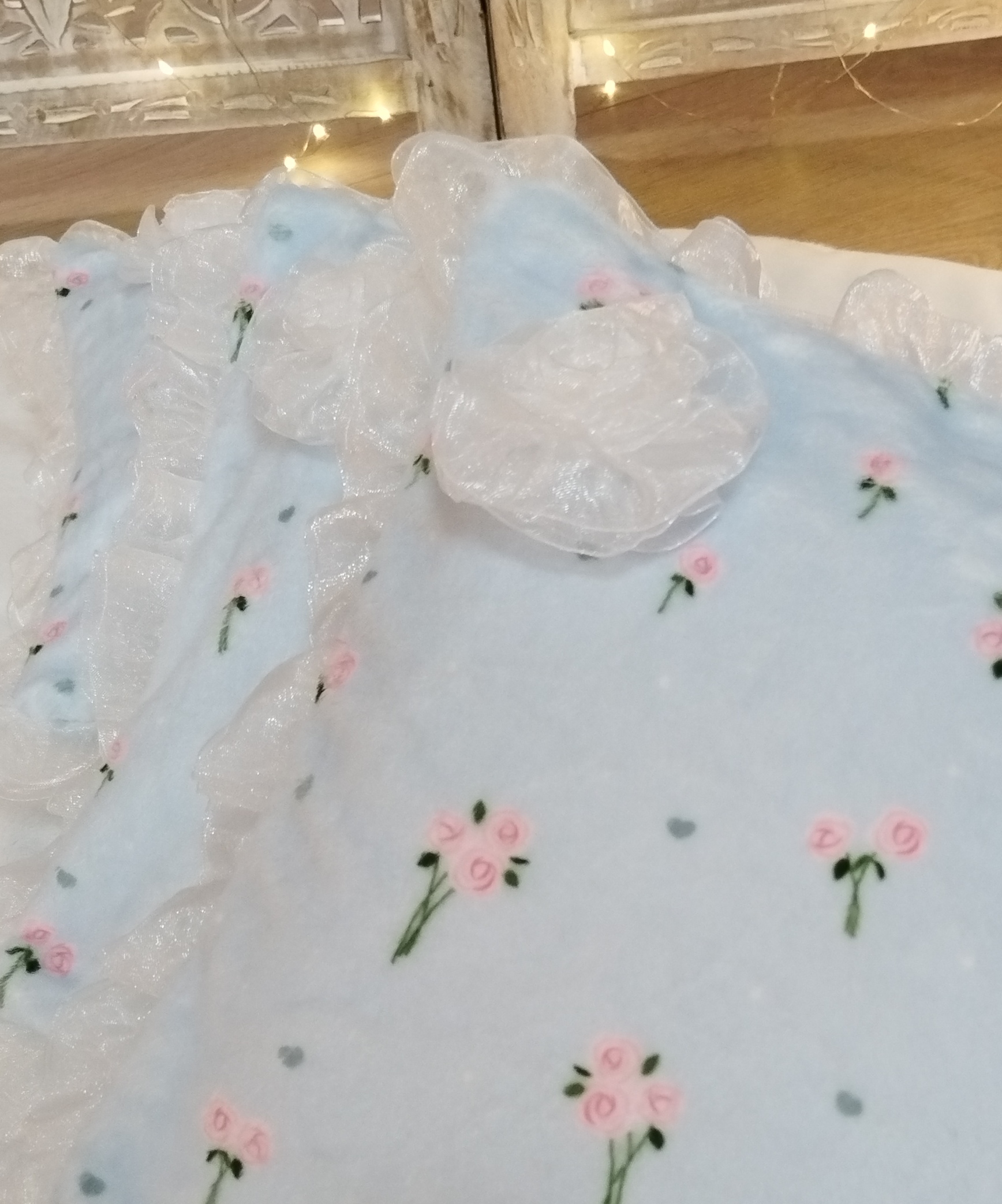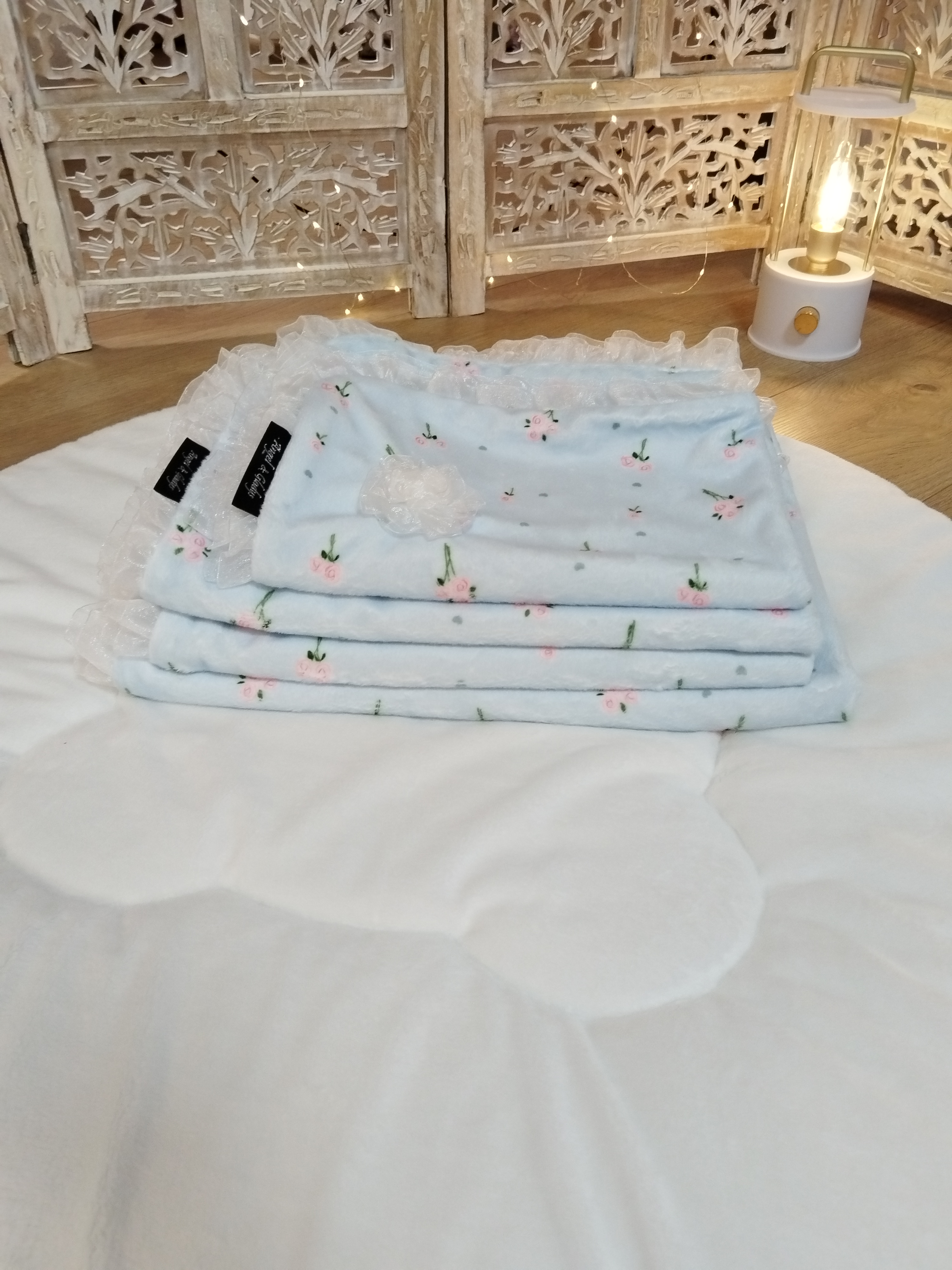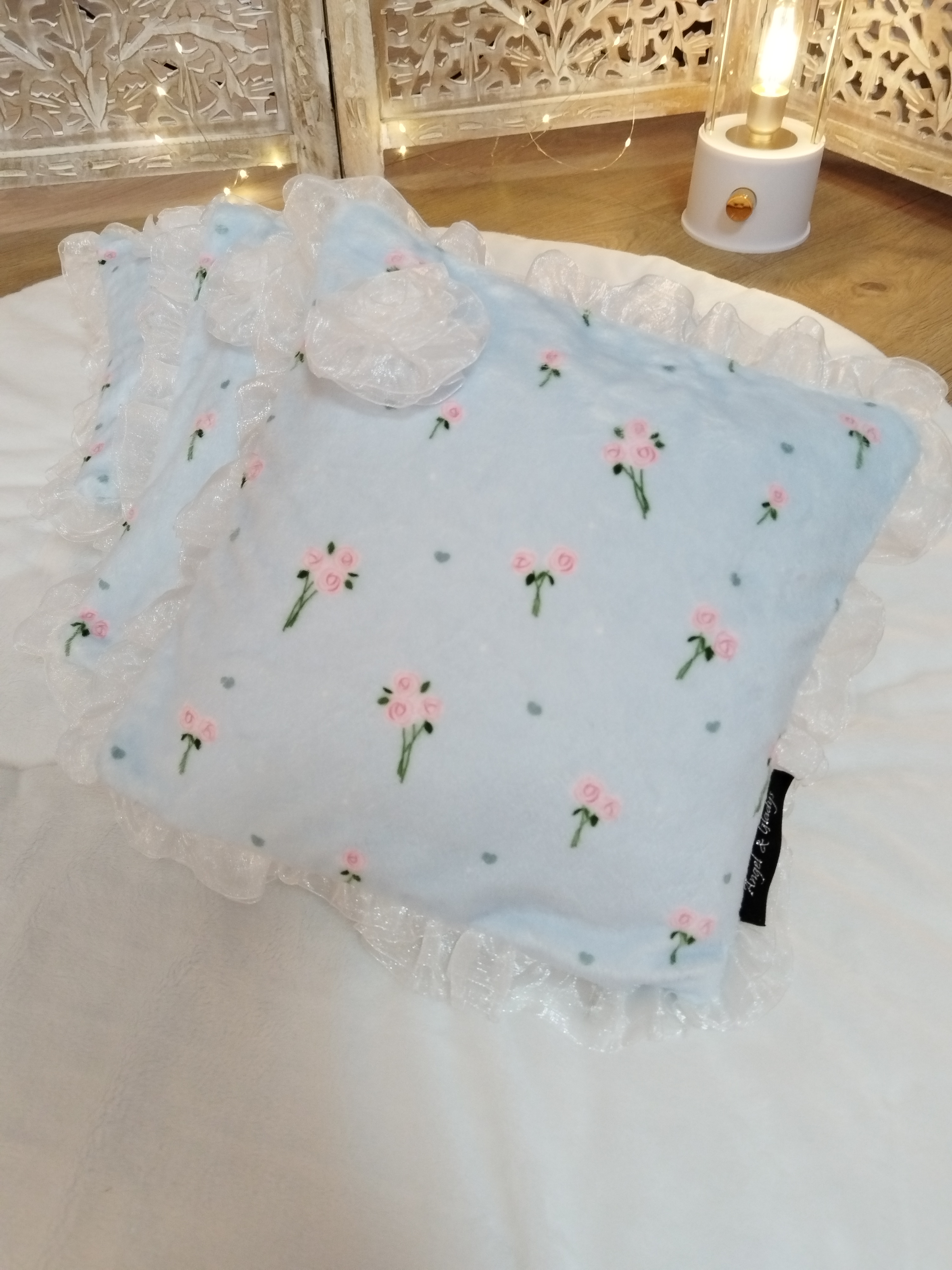 ✨ Modèle Couverture 📏 Dimensions • 60 × 40 cm • 50 × 70 cm • 80 × 60 cm ⚜️ Matière Minky doux avec volant en organza 🌸 Détails • Finition avec volant en organza 🧼 Conseils d’entretien •...